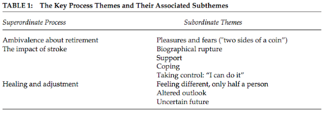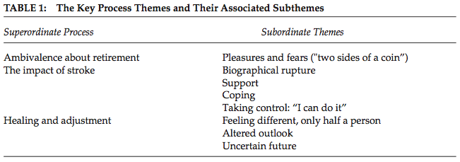 - 從本研究結果來看,似乎說明了退休和中風是不能分開看待的;事實上,一些關於退休的恐懼,例如:工作認同的喪失,也反映在中風造成的身體能力喪失經驗上。退休人員面臨的一些困難可能沒有得到解決,因為中風已經接管了生活。其他研究慢性疾病的文獻也發現了類似的反應(e.g., A. Thompson, Kent, & Smith, 2002)。